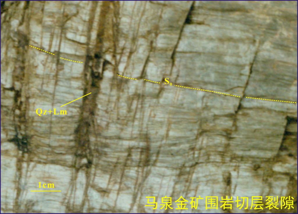 研究表明,马泉金矿赋矿的石炭纪地层中有金的初始富集岩性,在秦岭造山作用脆-韧性剪切变形过程中逐步形成了矿源层,印支-燕山期大规模岩浆浸入活动使金源层受到了立体加热,岩石中的热水上涌并淬取了矿源层中的金元素而形成含金热液。这种含金热液沿着断裂带迁移,金元素在适宜的温压条件下沉淀富集,在热场温度梯度的作用下含金热液持续循环,最终在侏罗纪(主体成矿时代197~162Ma)形成了马泉金矿。
