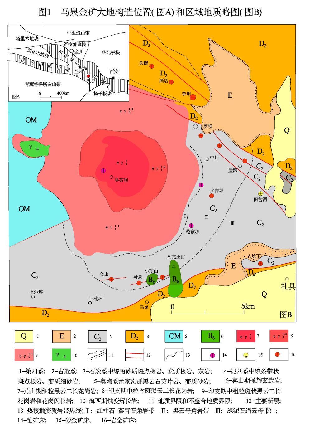 西秦岭是秦岭造山带的西延部位,位于华北板块、扬子板块和青藏特提斯造山带交汇的三角地带。在岷(县)~礼(县)东部地区,金矿化主要赋存于泥盆纪和石炭纪地层之中,明显受礼县~凤县深大断裂和“五朵金花”岩体群之一的中川复式岩体控制。一般认为中川岩体为地壳重熔S型二长花岗岩,经海西、迎支、燕山3期5次岩浆侵位形成,主侵入时代为210~160 Ma。印支中晚期和燕山早期岩浆构成其主体的3个同心环带,各个环带之间为脉动式接触关系。区域金矿床(点)围绕岩体呈半环状分布于热接触变质带中,大致距岩体1~8km(图1)。