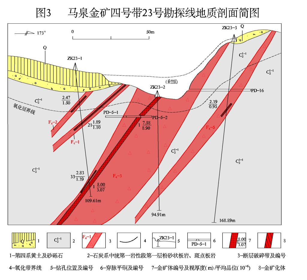 马泉金矿定位于中川岩体南外接触带上的石炭纪地层中浅变质碎屑岩中,矿区已发现9条矿化带,探明大小矿体几十个,其中4号带(图2)规模最大,金品位高,探明资源储量占矿床60%以上。金矿容矿围岩为石炭中统第一岩性段粉砂质板岩、斑点板岩和千枚状板岩,矿体主要受NNE向和NEE向两组断层破碎带控制,花岗斑岩脉和煌斑岩脉与断层相伴产出。4号带受NEE向断层破碎带控制(图2、图3),该断层发育于乱石山-庙山背斜构造轴部一带,由一组走向断层组成,构造岩石主要为构造角砾岩和碎裂岩,断层与围岩往往以密集裂隙形式渐变过渡。矿区热液活动和围岩蚀变集中发育于断层破碎带及其围岩裂隙中,热液活动见有有6期,其中金属硫化物石英细(网)脉及硅化、绢云母化、绿泥石化、黄铁矿化、毒砂化等与金矿化关系密切。