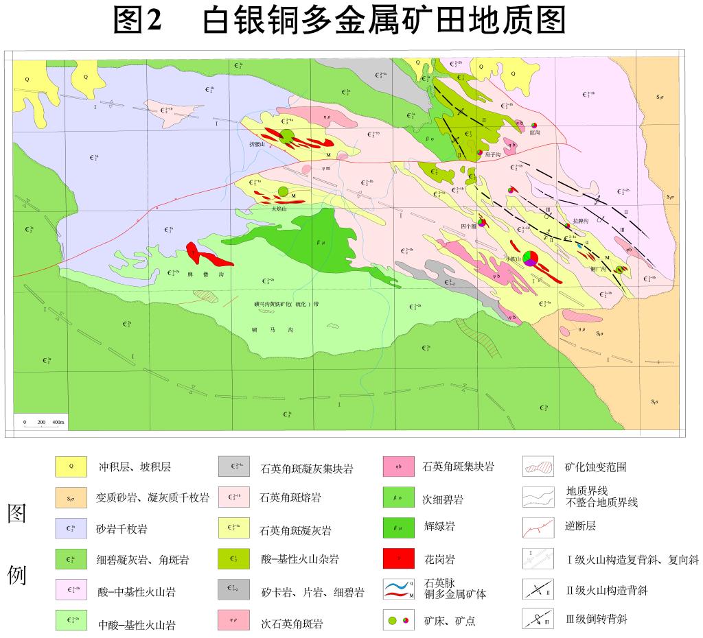 矿田地质:白银矿田主要出露早古生代以酸性为主的海相火山岩,地层走向为NWW向。地层受区域变质作用,多片理化,片理化带与褶皱方向基本一致。主要含矿地层为寒武系石英角斑凝灰岩。矿区存在古火山机构,发育NWW向系列褶皱,控制了矿床的产出,断层主要是折腰山南~房子沟逆推断层,其次有叠加在不整合面上的次级断层,断层多形成于成之矿后,对矿体起一定破坏作用。