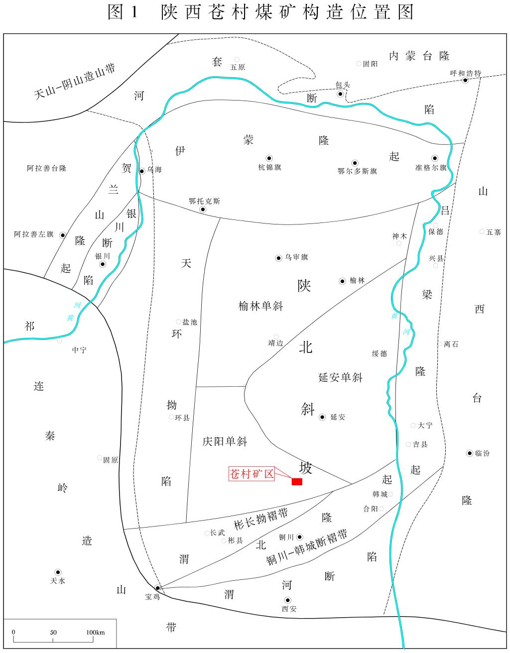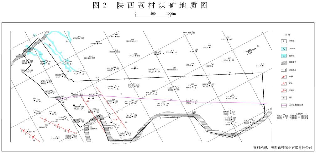黄陵矿区地处鄂尔多斯盆地陕北斜坡带庆阳单斜东南角,南与彬长坳褶带毗邻,北与延安单斜和榆林单斜接壤,总体构造格架为向北西缓倾斜的单斜构造(图1)。苍村煤矿位于黄陵矿区东南部平缓褶皱区与西峪-南峪口隆起区的过渡地带。矿区地层平缓,倾角3~4°,沿走向波状起伏。钻孔揭露地层由老至新依次为三叠系上统永坪组、侏罗系中统延安组和直罗组、新近系上新统、第四系(图2)。其中侏罗系中统延安组为含煤地层,厚度34.35~119.6m,平均厚度96.08m,呈北厚南薄,西厚东薄的分布规律。含矿地层从下至上可分为三段六个旋回,各旋回底部以灰白色砂岩开始,向上为深灰色粉砂岩及灰黑色泥岩,主煤层2号煤位于第一旋回的中、下部,煤层顶底板为粉砂质泥岩。矿区地质构造属于简单类型,仅在井田东南部和北部发育宽缓的小型褶皱,在井田南部见有F2、F3两条正断层,断层有一定位移并对矿层局部改造成“地堑状”(图3)。