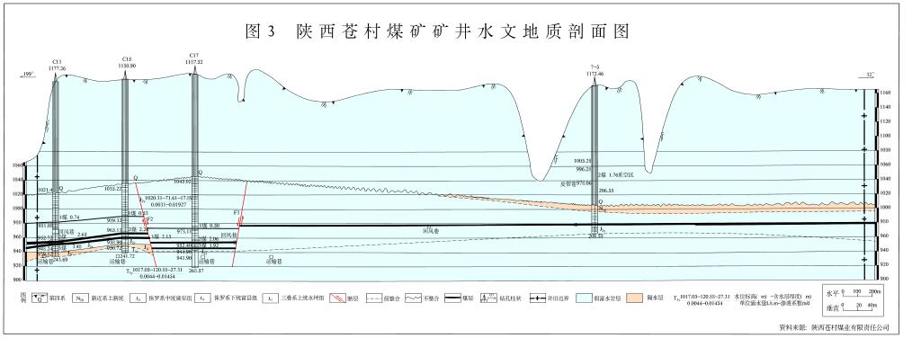 矿区地下水分为两大类:第四系松散层孔隙裂隙水和基岩裂隙水。按地下水的埋藏条件及含水层的性质,划分为四个含水层:第四系黄土潜水含水层、中侏罗统直罗组砂岩裂隙潜水含水层、中侏罗统延安组砂岩裂隙承压水含水层、上三叠统永坪组砂岩裂隙承压含水层,以及侏罗系中统延安组上部相对隔水层、延安组下部及富县组相对隔水层。苍村煤矿受采掘破坏或者影响的含水层主要是延安组中部的含水层,富水性较弱;间接充水含水层直罗组下段含水层,富水性中等。预计矿井正常涌水量50m3/h,最大涌水量100m3/h。矿井水文地质条件属中等。