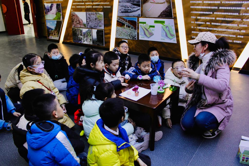 地质博物馆副馆长马叶情带领同学们观察地质博物馆矿物厅标本,并为其深入浅出地讲解矿物基础知识,以生活中常见的矿物——石英和方解石为例,引导青少年观察矿物、鉴定矿物,探究物质形成的过程。